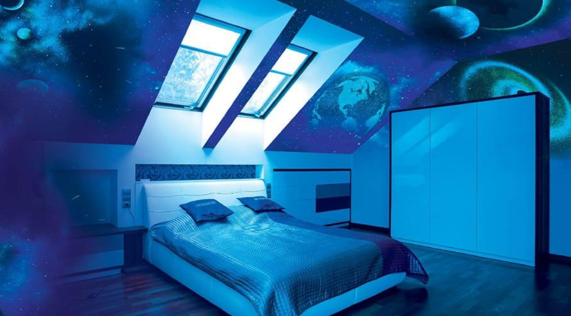 Některé dětské pokoje mají dokonce kombinaci denní oblohy a noční galaxie, přes den modré nebe s jemně rozfoukány mraky, a večer hvězdy.