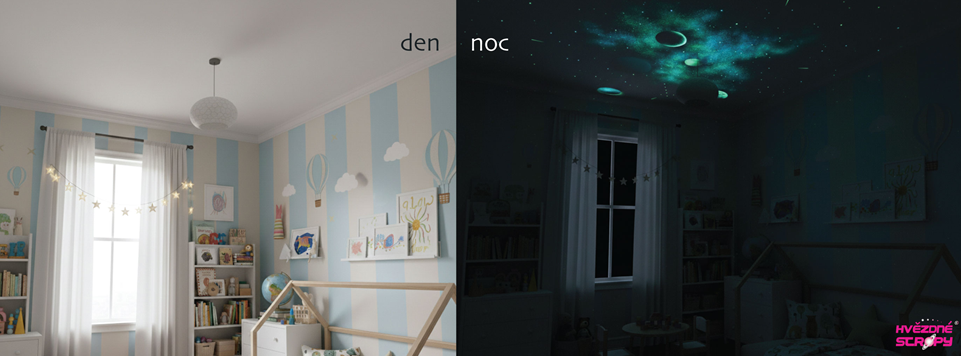 Hvězdné Stropy nevytváří klasickou dekoraci. Nejde o obraz, který si prohlížíte přes den, ale o zážitek, který ožívá až ve tmě.