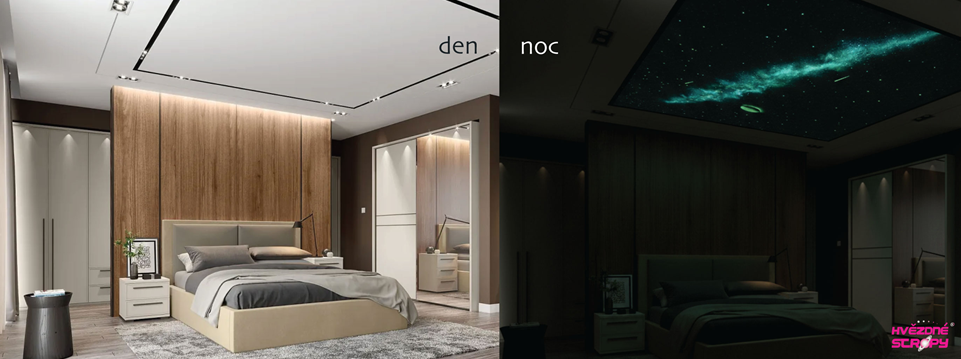 - Ve dne je strop vizuálně čistý a nenápadný. V noci se promění v překvapivý, romantický a uklidňující prvek.