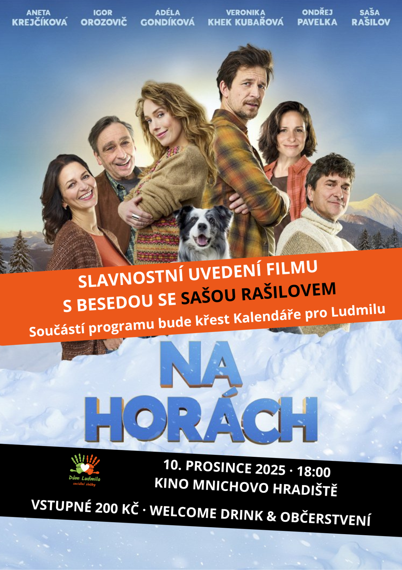 Můžete se těšit na promítání nového filmu Na horách a besedu s hercem Sašou Rašilovem, který se s diváky podělí i o své zážitky z natáčení. Součástí večera bude také slavnostní křest druhého ročníku Kalendáře pro Ludmilu 2026.