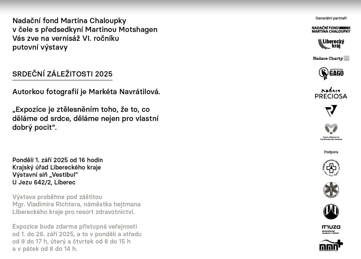Výstava Srdeční záležitosti, která letos zavítala dokonce i do dalekého Japonska na EXPO, bude mít vernisáž také na Krajském úřadu Libereckého kraje. Ta začíná 1. září od 16 hodin v tamním vestibulu. Záštitu nad akcí, jež potrvá až do 26. září, převzal Vladimír Richter, náměstek hejtmana pro resort zdravotnictví