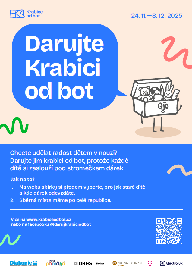 Diakonie ČCE proto již tradičně pořádá sbírku Krabice od bot, největší českou sbírku vánočních dárků pro děti v nouzi. Každý rok se podaří shromáždit na 60 000 dárků, které těmto dětem připomenou, že na ně někdo myslí a že jsou důležité.