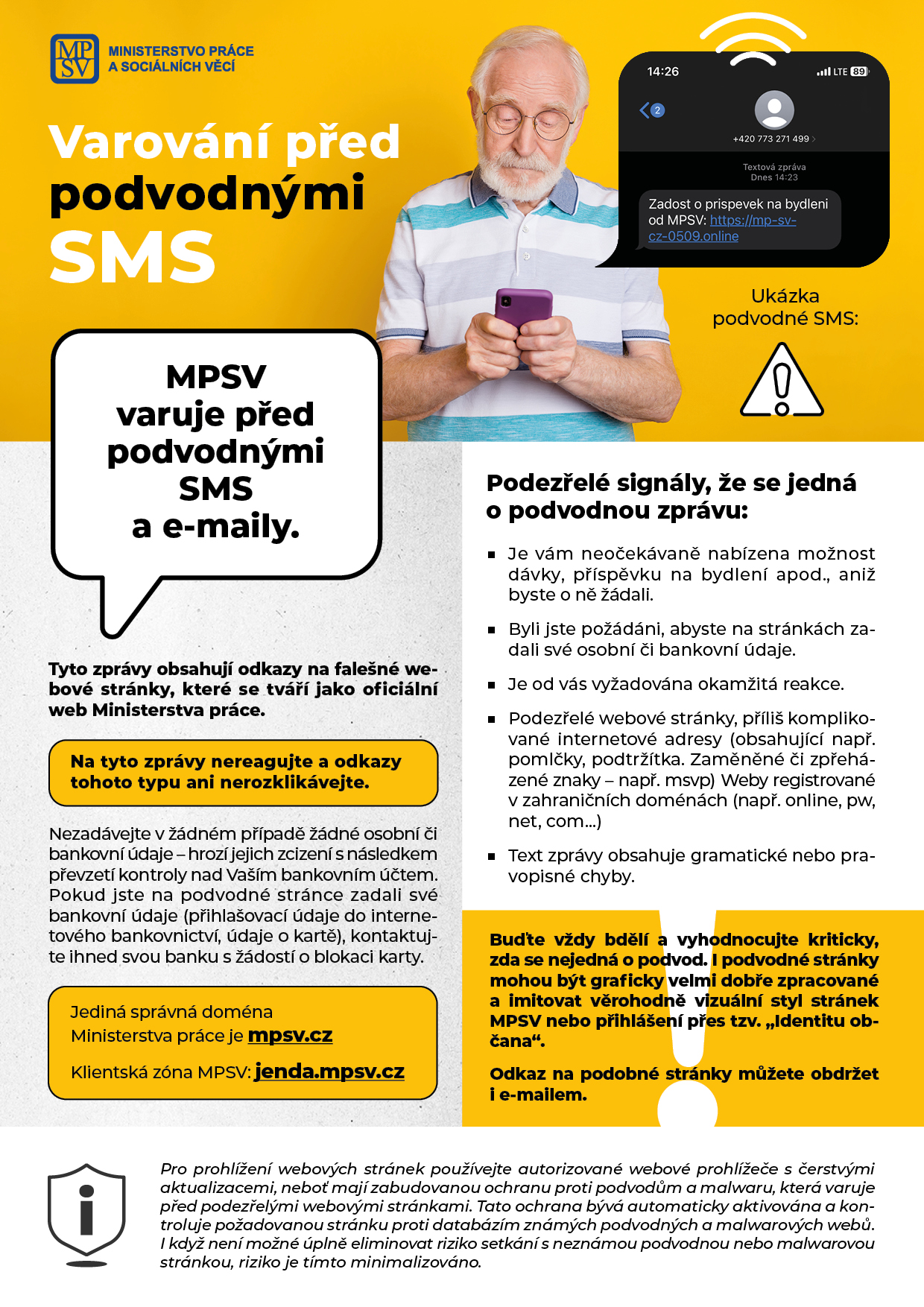 NIKDY neklikejte na podvodné odkazy šířené SMS zprávami a e-maily. Vedou na falešné stránky, které se tváří jako oficiální web. Jedná se o phishing.