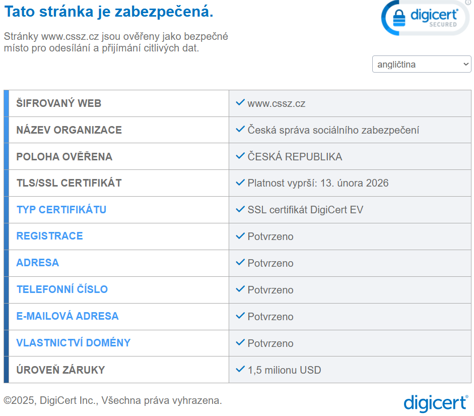 Oficiální webové stránky ČSSZ jsou www.cssz.cz a eportal.cssz.cz a jejich pravost poznáte podle digitální pečeti společnosti DigiCert umístěné na stránce vpravo dole. Po kliknutí na symbol/obrázek pečeti se zobrazí identifikační údaje ČSSZ – tak si snadno ověříte, že jste na oficiálním webu.