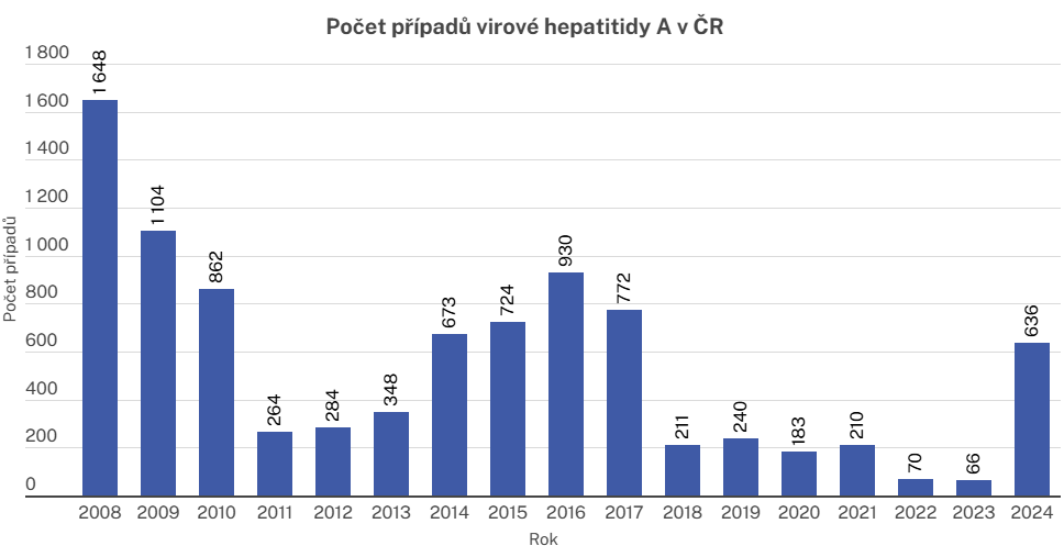 Trend onemocnění virovou hepatitidou A v České republice v letech 2008–2024. (Zdroj: Státní zdravotní ústav)