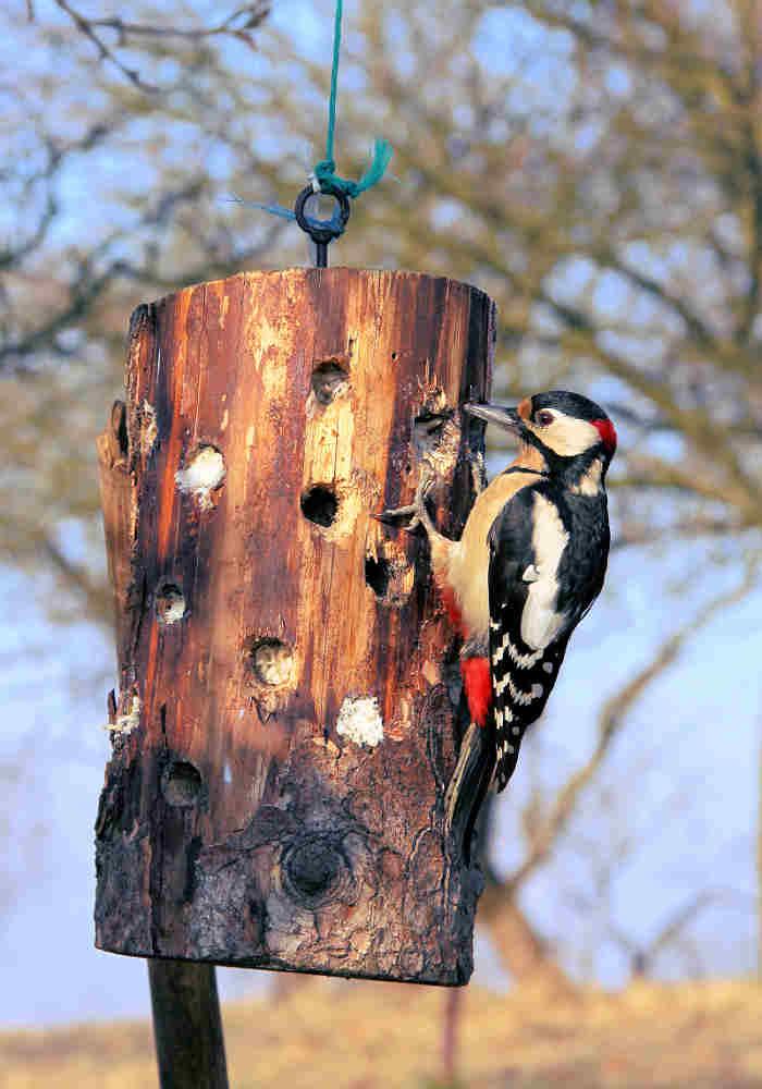 Strakapoud velký na špalku s vecpaným hovězím lojem. Pro strakapoudy ideální forma servírování!